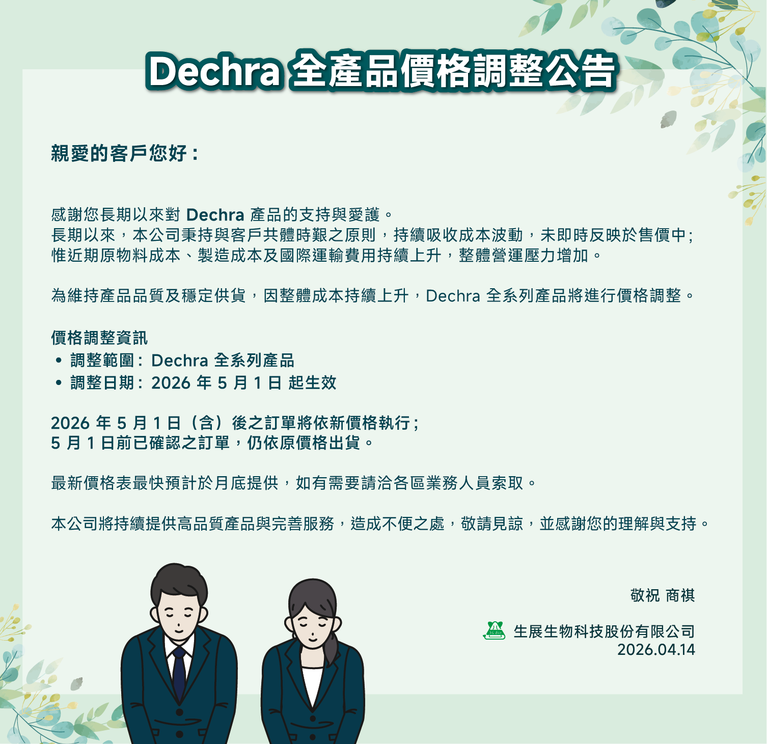 2026-04-14Dechra 全產品價格調整公告